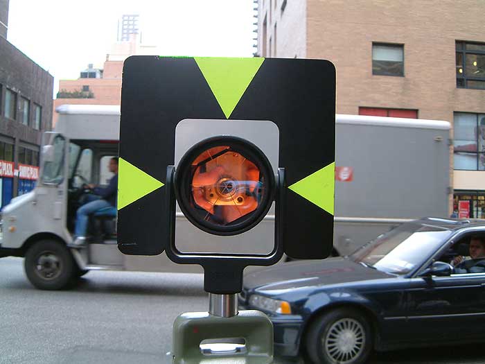 Strolling down 3rd towards lunch when the pretty orange glassy bit on this theodolite caught my eye. I pause and see you know who looking back.